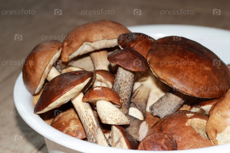 Грибы в белой миске с крупным планом. Leccinum scabrum, подосиновик, подберезовик, подберезовик. Свежие грибы в тазу