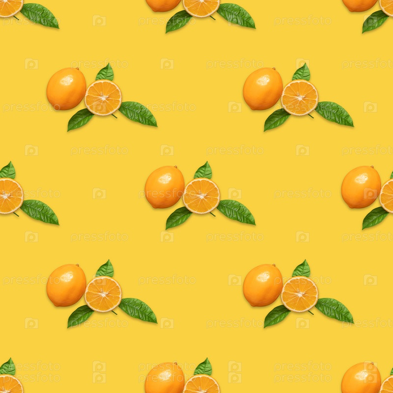 Бесшовный рисунок с лимоном Мейера и зелеными листьями на желтом фоне. Фруктовый узор. Тропический абстрактный фон. Концепция минимальных фруктов