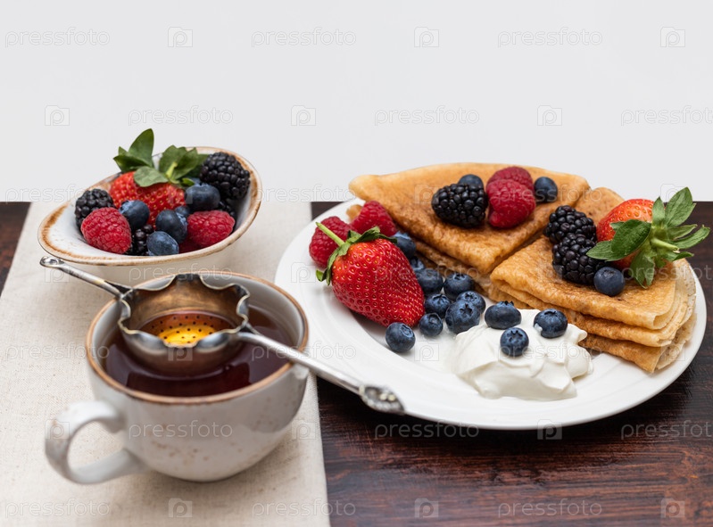 Блины с ягодами и сметаной, чашка чая на деревянном столе. Вкусный завтрак. Вид сбоку