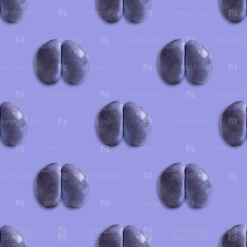 Бесшовный рисунок с уродливой сливой на фиолетовом фоне. Тропический абстрактный фон. Уродливая еда