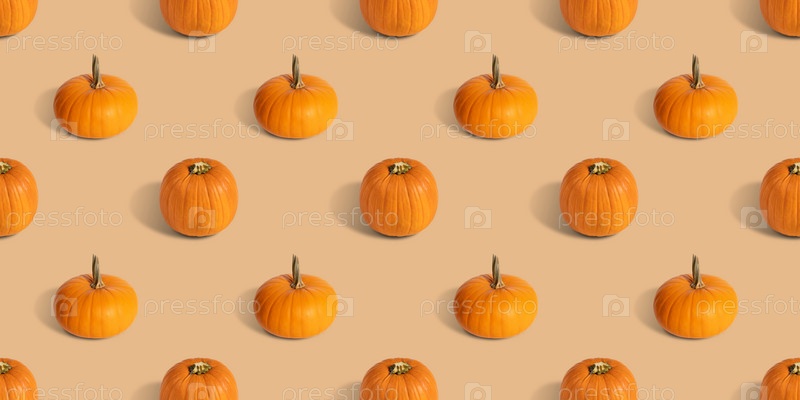 Бесшовный узор из тыквы на бежевом фоне. Баннер. Фон тыквы Хэллоуина. Осенняя концепция