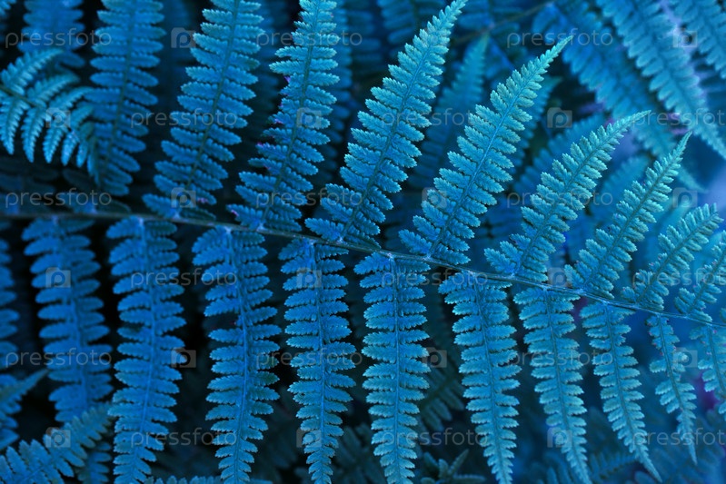 Красивый голубой неоновый папоротник крупным планом. Цветочная текстура и фон, узор. Светящаяся синяя листва папоротника. Текстурированные листья. Креативный образ