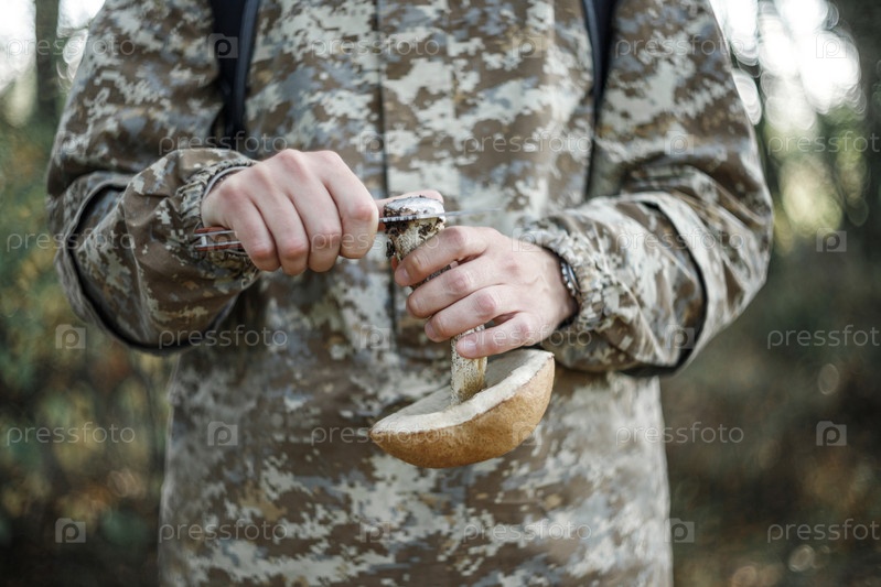 Сборщик отрезает ножку гриба. Сбор грибов в лесу. Мужские руки с грибами. Боровик подберезовик