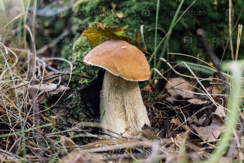 Съедобная грибная булочка в лесу, макро. Красивые грибы белые грибы, белые грибы на фоне зеленой травы крупным планом