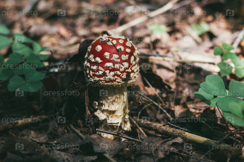 Мухомор в траве крупным планом. Гриб с красной шляпкой с белыми точками. Ядовитый гриб