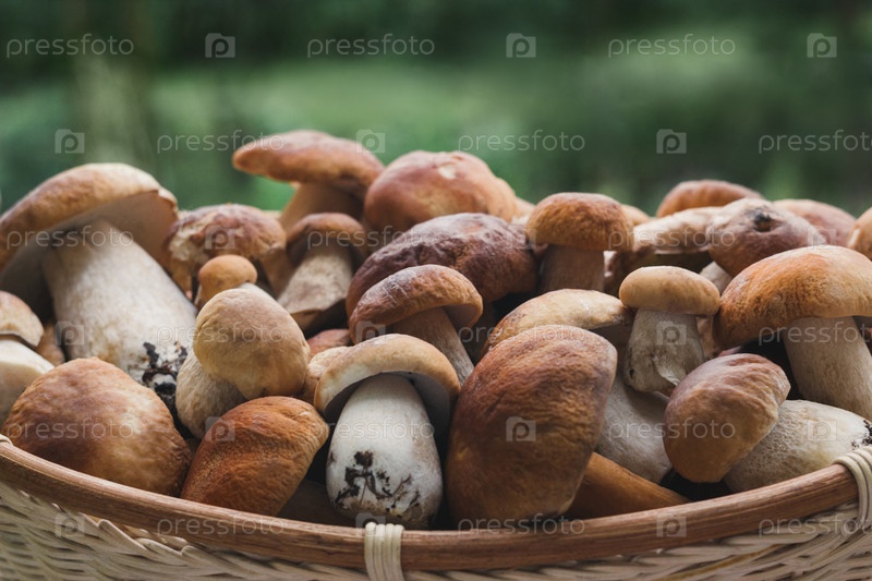 Свежие грибы подосиновики в корзине на зеленом фоне. Съедобные вкусные грибы подберезовики, пенни булочка, белые грибы, белые грибы. Выборочный фокус