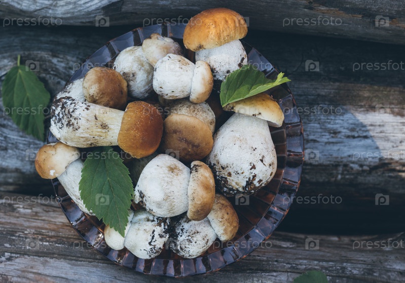 Грибы в миске с листьями на деревянном фоне. Подберезовик, пенни булочка, белые грибы, белые грибы