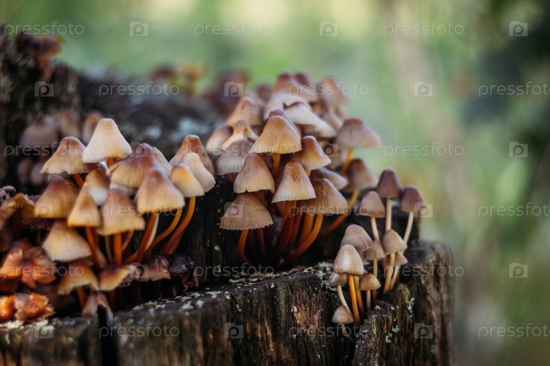 Группа коричневых маленьких грибов на дереве на зеленом фоне, макро. Несъедобный гриб мицена