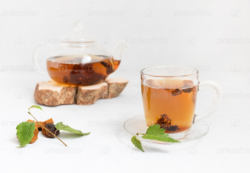 Чай из чаги в стеклянной кружке и чайнике на белом фоне. Модный здоровый напиток. Напиток с кусочками подберезовика