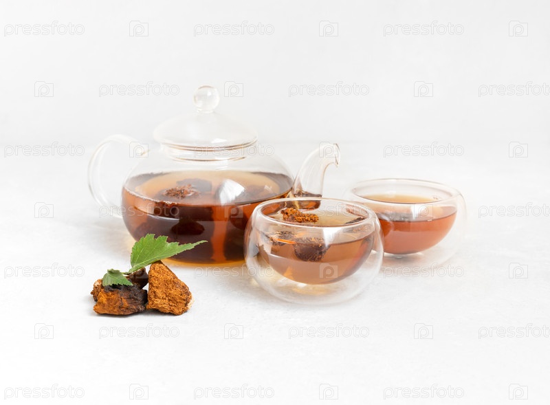 Настой чаги в стеклянных мисках и чайнике. Чай из чаги на белом фоне