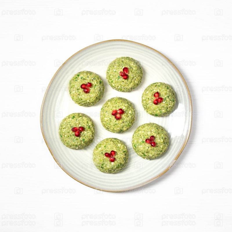 Пхали с фасолью на белом фоне. Традиционное грузинское блюдо из овощей, орехов и специй. Плоская планировка, вид сверху