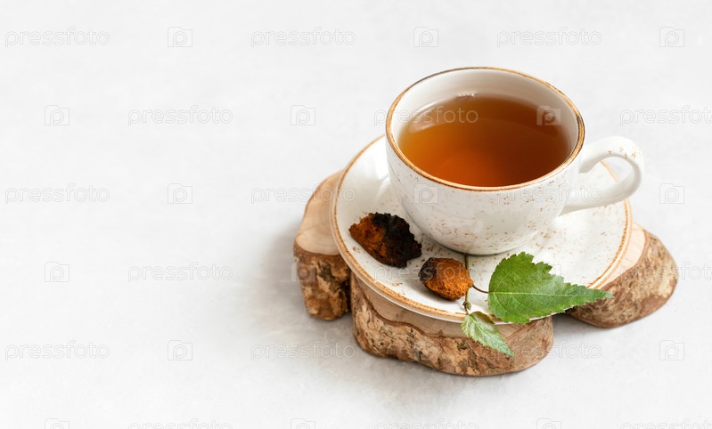 Чай из чаги в белой чашке на белом фоне. Настой березового гриба. Модный здоровый напиток. Скопируйте пространство