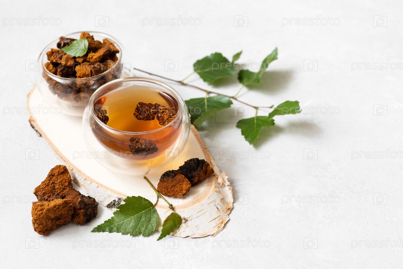 Чай из чаги в стеклянной посуде. Модный здоровый напиток. Органический напиток с березовым грибом