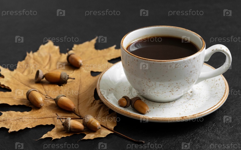 Осенний натюрморт с чашкой кофе, листьями и желудями на черном фоне. Желудь кофе. Заменитель кофеина