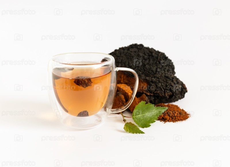 Чашка с напитком из чаги и грибом из чаги на белом фоне. Напиток с березовым грибом