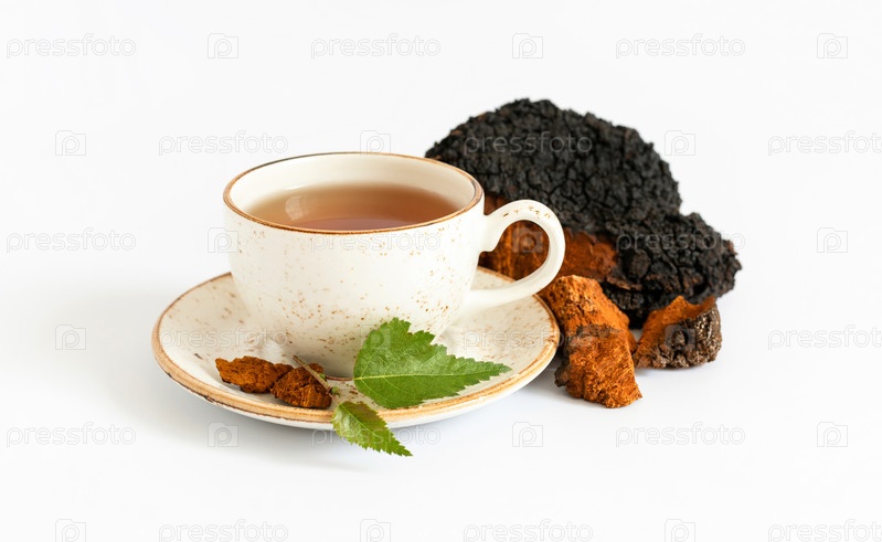 Чай чага, изолированные на белом фоне. Органический напиток с березовым грибом