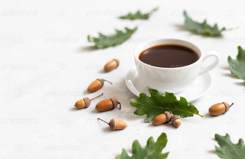 Уютный натюрморт с чашкой кофе, дубовыми листьями и желудями на белом фоне. Желудь кофе. Без кофеина. Копировать пространство