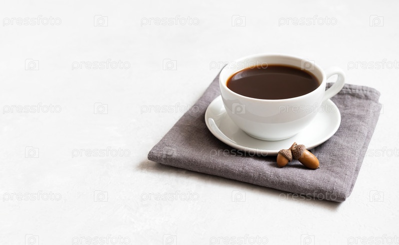 Чашка черного кофе на серой салфетке. Кофе желудь на белом фоне. Осенняя минимальная концепция. Заменитель кофеина. Копировать пространство