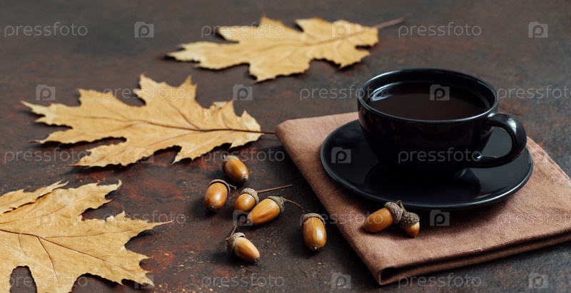 Осенний натюрморт с чашкой кофе, сухими листьями и желудями на коричневом фоне. Желудь кофе. Заменитель кофе