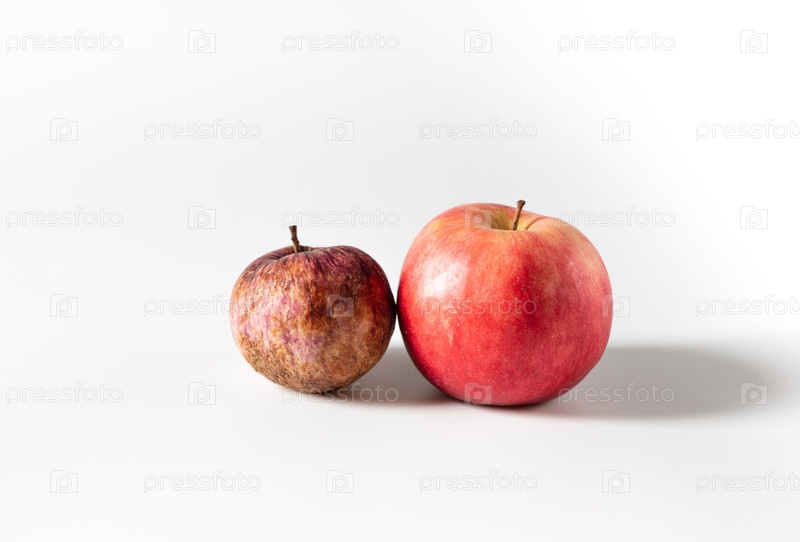 Гнилые старые и свежие спелые яблоки на белом фоне. Модная уродливая концепция еды. Проблема пищевых отходов