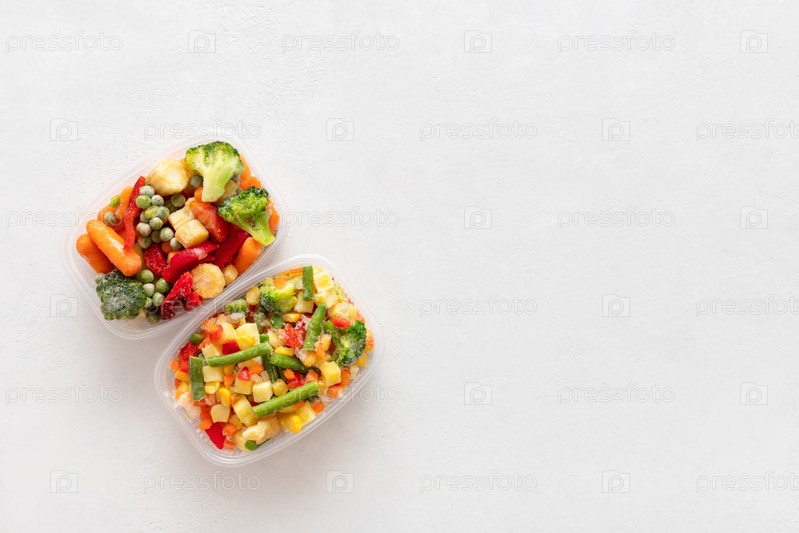 Смешивание замороженных овощей в пластиковых контейнерах на белом фоне. Вид сверху. Скопируйте пространство