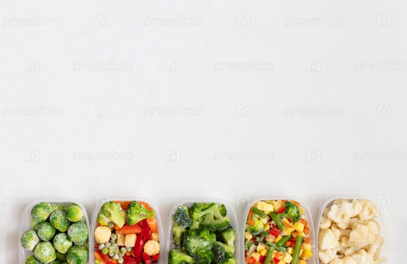 Граница замороженных овощей в пластиковых контейнерах на белом фоне. Замороженные продукты. Скопируйте пространство, посмотрите сверху