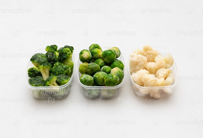Смесь капусты замороженных овощей в контейнерах на белом фоне. Брюссельская капуста, брокколи, цветная капуста