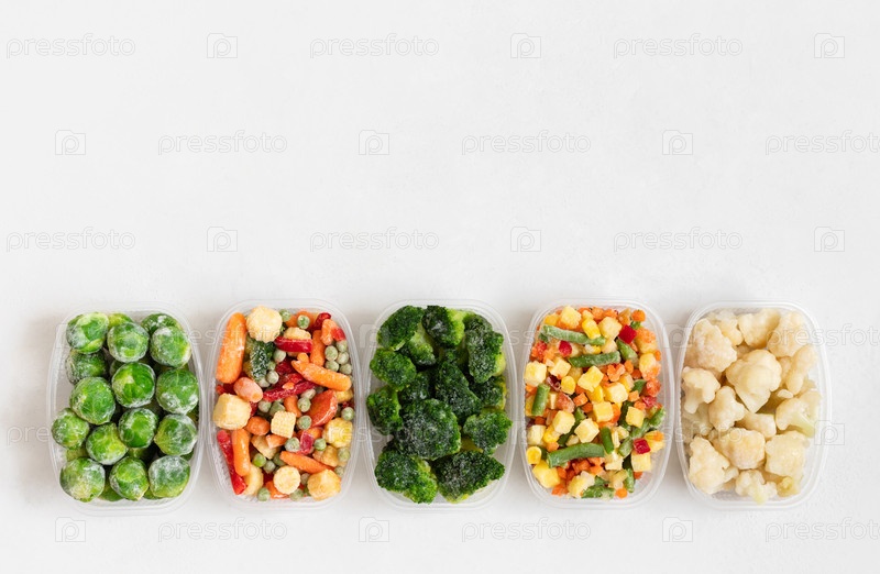 Замороженные овощи смешивают в контейнерах на белом фоне. Скопируйте пространство, посмотрите сверху