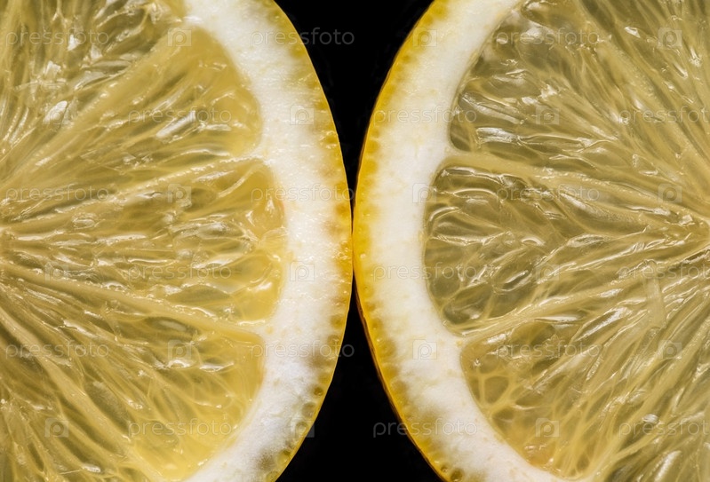 Нарезанный желтый лимон на черном фоне крупным планом. Продовольственный фон. Плоская укладка. Сочный спелый свежий цитрусовый лимон. Вид сверху, макро
