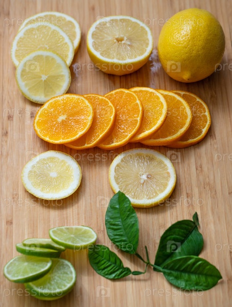 Нарезанные цитрусовые на деревянной разделочной доске. Сочные спелые ломтики апельсина, лимона и лайма на деревянном фоне. Фруктовый микс