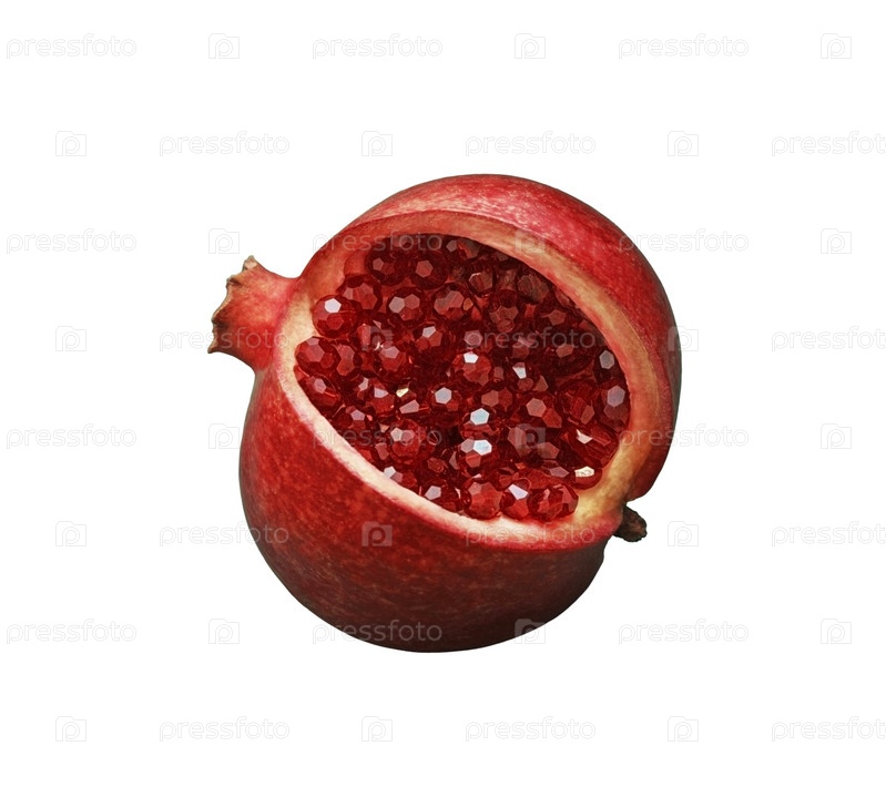 Красивый красный нарезанный гранат на белом изолированном фоне. Плод граната с красными блестящими гранулами граната вместо семян и зерен. Макро, крупный план, абстракция. Ювелирный необычный фрукт