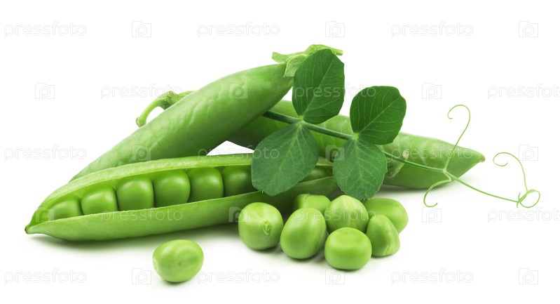 Горох изолирован. Свежий зеленый горошек и зерна гороха с листьями на белом фоне