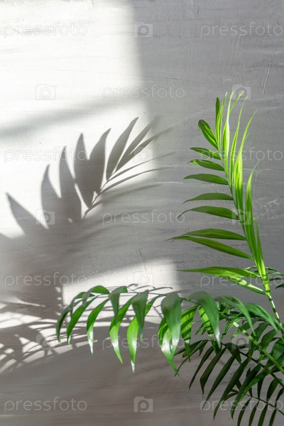 Пальмовый лист на сером текстурированном фоне с глубокой длинной тенью и естественным солнечным светом