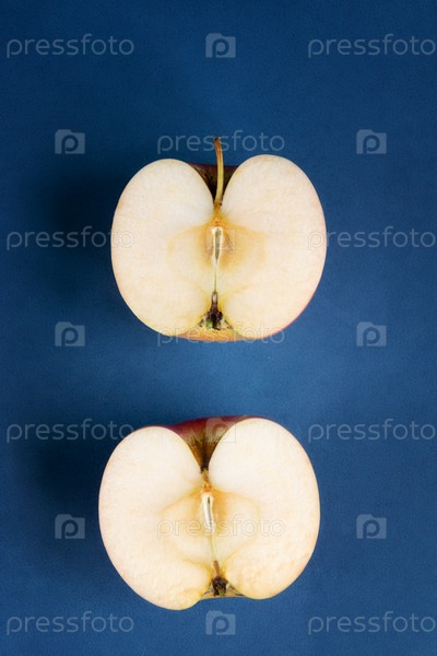 Половина вкусного свежего яблока на синем фоне, пустое место для текста