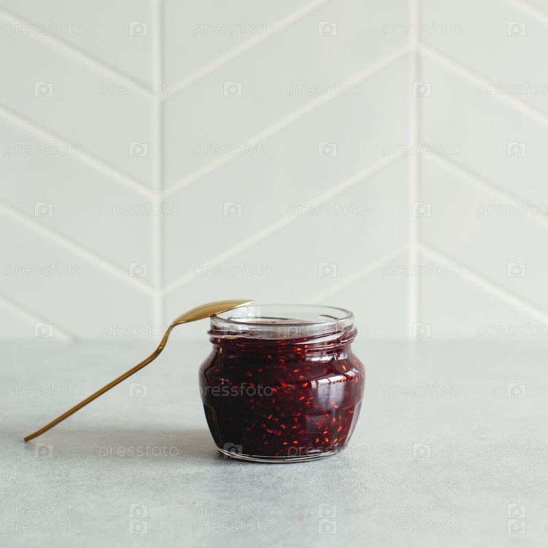 Маленькая стеклянная банка с готовым к употреблению малиновым вареньем и золотой ложкой на фоне серой кухонной плитки с копией пространства