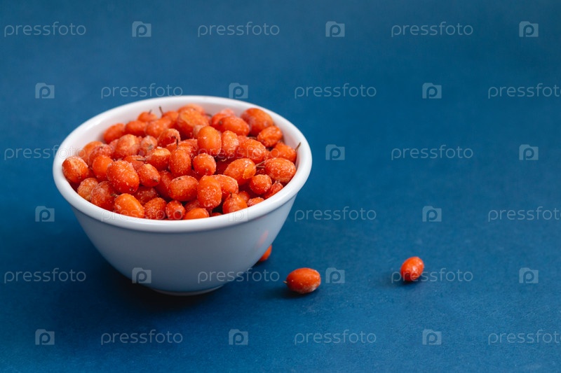 Ягоды облепихи в белой тарелке на синем фоне. концепция здорового питания