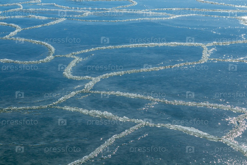 Зимний пейзаж замерзшего моря в солнечный февральский день. Красивый голубой гладкий лед с трещинами. Естественный фон (фокус на льду)
