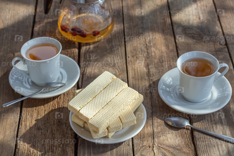Чаепитие со сладкими русскими вафлями на деревянном фоне. Традиционные сладости и десерт
