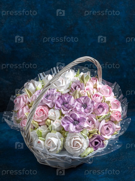 Зефирный букет цветов в корзине на голубом фоне