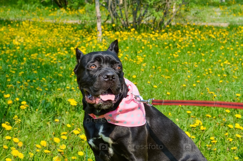 Портрет красивой черной собаки породы итальянская кане корсо. Собака сидит на лужайке в парке на фоне желтых цветов одуванчика