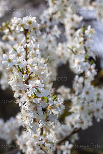 Белые красивые цветы фруктового дерева, весенний сад с цветущими деревьями
