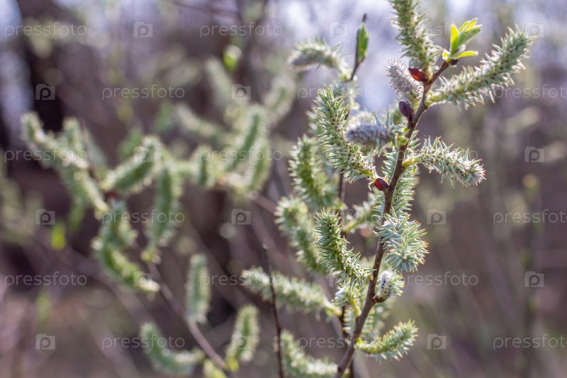 Ветвь ивы (Salix caprea) с шерстью, пушистые цветы ивы. Пасха. Вербальное воскресенье. Салик капреи в парке, ветки ивы (Salix caprea) с цветящимися бутонами