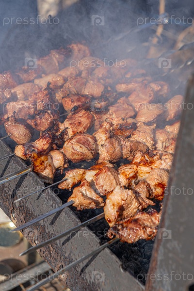 Жареный шашлык на металлическом шампуре. Жареное мясо, приготовленное на гриле. Кусочки отбивной из свежей говядины барбекю. Традиционное восточное блюдо, шашлык. Гриль на углях и пламени, пикник, уличная еда