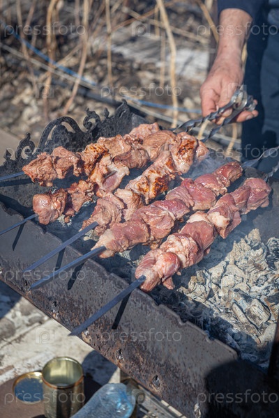 Жареный шашлык на металлическом шампуре. Жареное мясо, приготовленное на гриле. Кусочки отбивной из свежей говядины барбекю. Традиционное восточное блюдо, шашлык. Гриль на углях и пламени, пикник, уличная еда