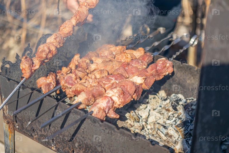 Жареный шашлык на металлическом шампуре. Жареное мясо, приготовленное на гриле. Кусочки отбивной из свежей говядины барбекю. Традиционное восточное блюдо, шашлык. Гриль на углях и пламени, пикник, уличная еда