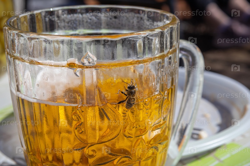 Большая черно-желтая пчела пьет золотое пиво из пинты