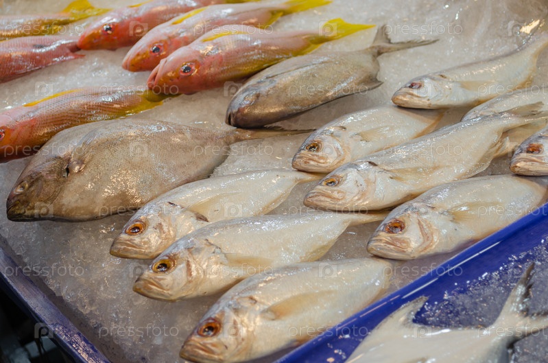 Свежая рыба на белом прилавке на рынке морепродуктов