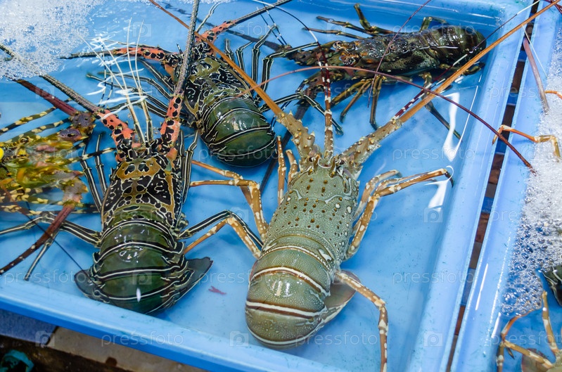 Живые свежевыловленные омары в Сиамском заливе крупным планом в лотках с водой на рынке морепродуктов в Паттайе