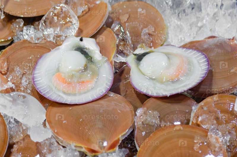 Морские гребешки со свежими моллюсками на льду на прилавке на рынке морепродуктов в Таиланде