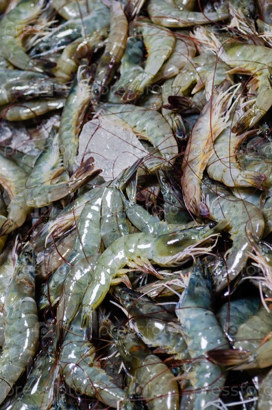 Свежие только что пойманные огромные королевские креветки на льду